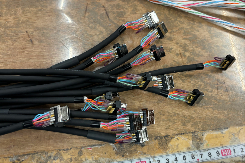 切断 → 圧着・半田 → 組立 → 導通検査 → 最終仕上げ 品質管理のもと、1本ずつ丁寧に加工します。